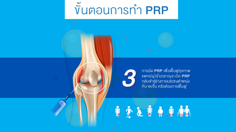 3.การฉีด PRP เพื่อฟื้นฟูสุขภาพ แพทย์ผู้เชี่ยวชาญจะฉีด PRP กลับเข้าสู่ร่างกายบริเวณตำแหน่งที่บาดเจ็บ หรือต้องการฟื้นฟู